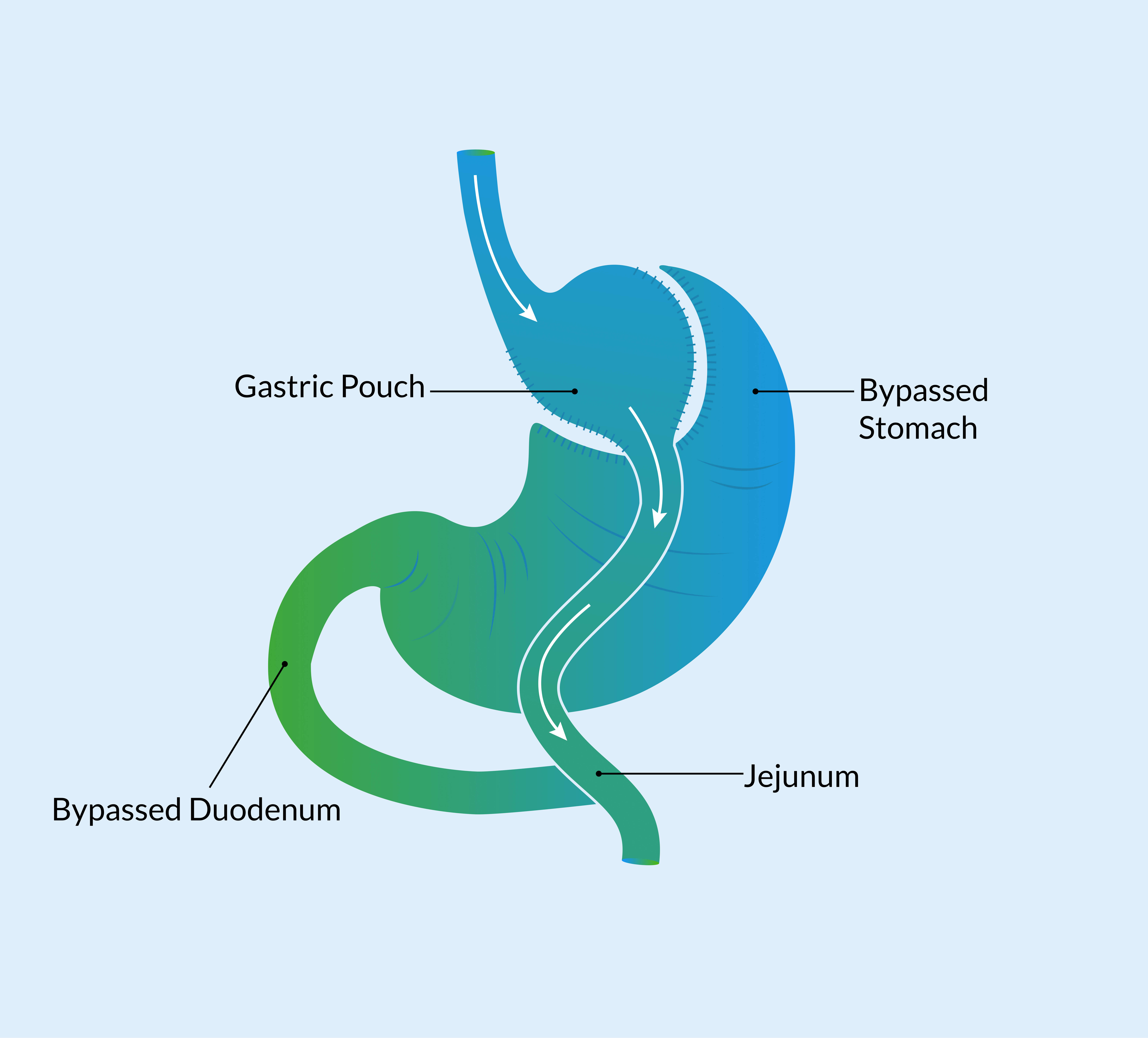 The small intestine is divided, and the lower portion is connected directly to the small stomach pouch. This bypasses the larger part of the stomach and a portion of the small intestine, reducing the absorption of calories and nutrients.